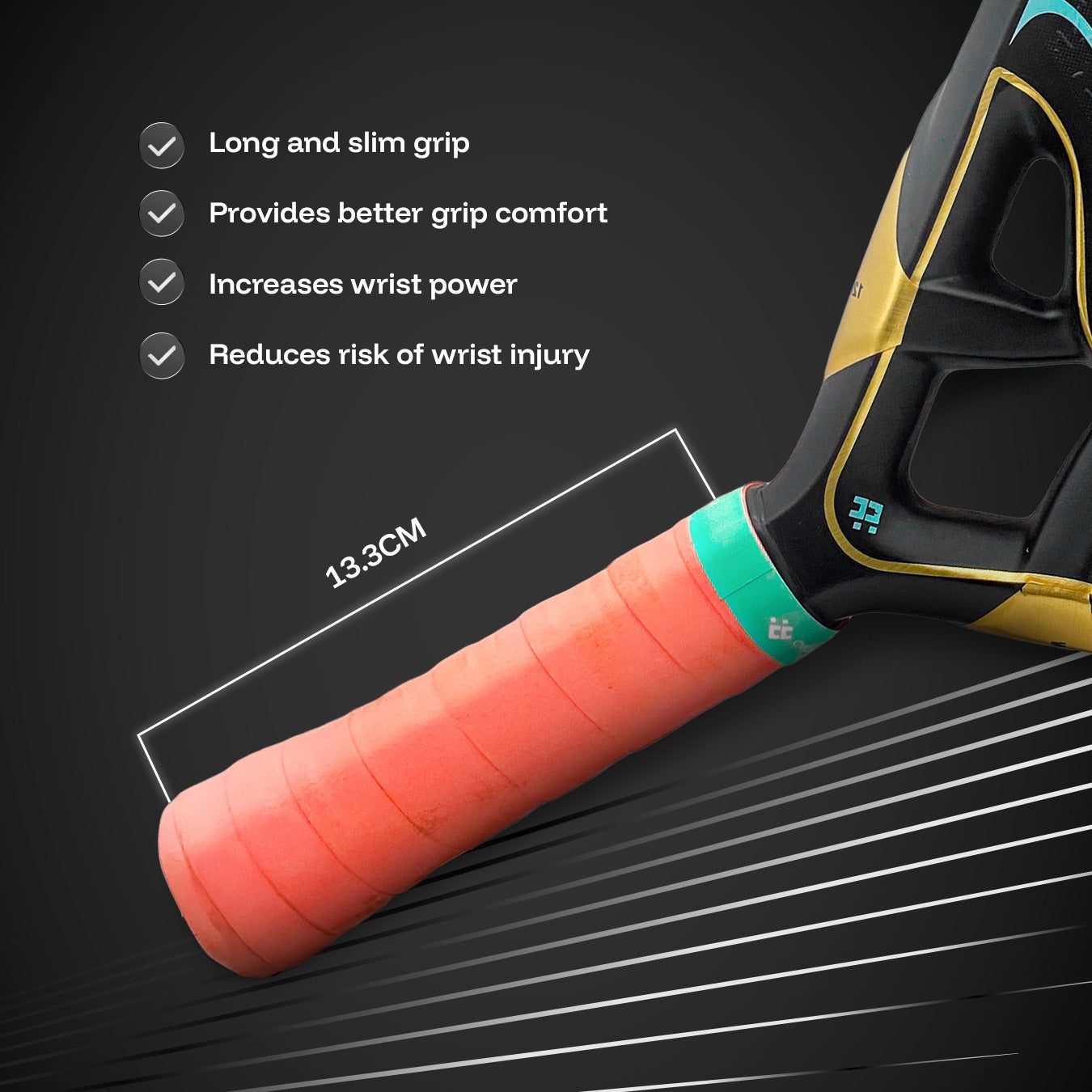 With the Azire, you can take every opportunity to attack with power and defend with a high quality return. - Further more , Its medium and proper 13.3cm length of grip size not only could effectively prevent wrist injury, but also makes it more handy to generate great power, allows you to switch in-between power and control with ease!